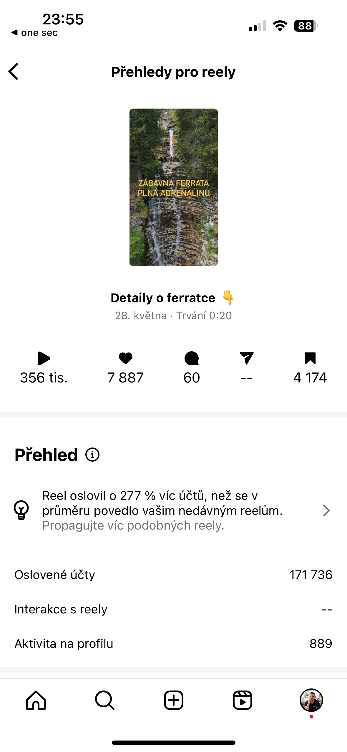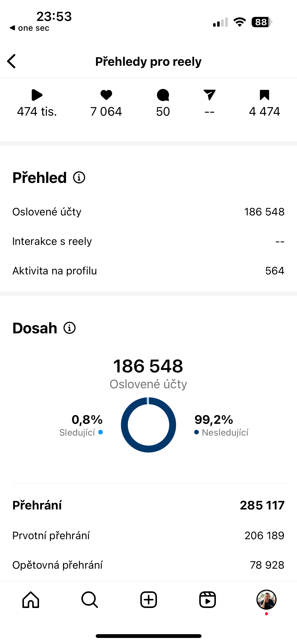 Na svůj profil jsem na přelomu května a června 2024 nahrál 8 videí a mým cílem bylo posunout profil. Právě autentická a originální videa zabrala slušně. Počet oslovených účtů se nakonec zastavil na čísle 467 424. Čtyři videa dokonce zaznamenala víc než čtvrt milionu zobrazení.